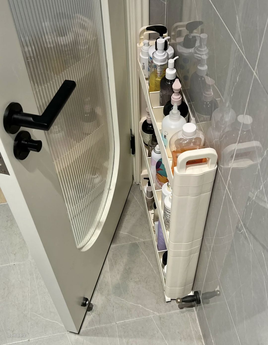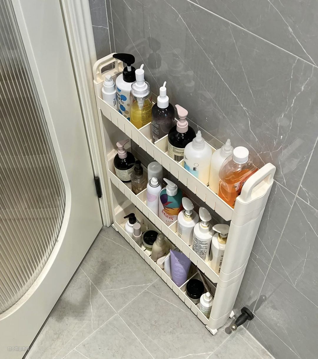后来我又给卫生间回购了一个,因为小卫生间的收纳空间有限,洗漱用品直接摆在台面上又显得凌乱,就用它把洗护用品藏在门后。