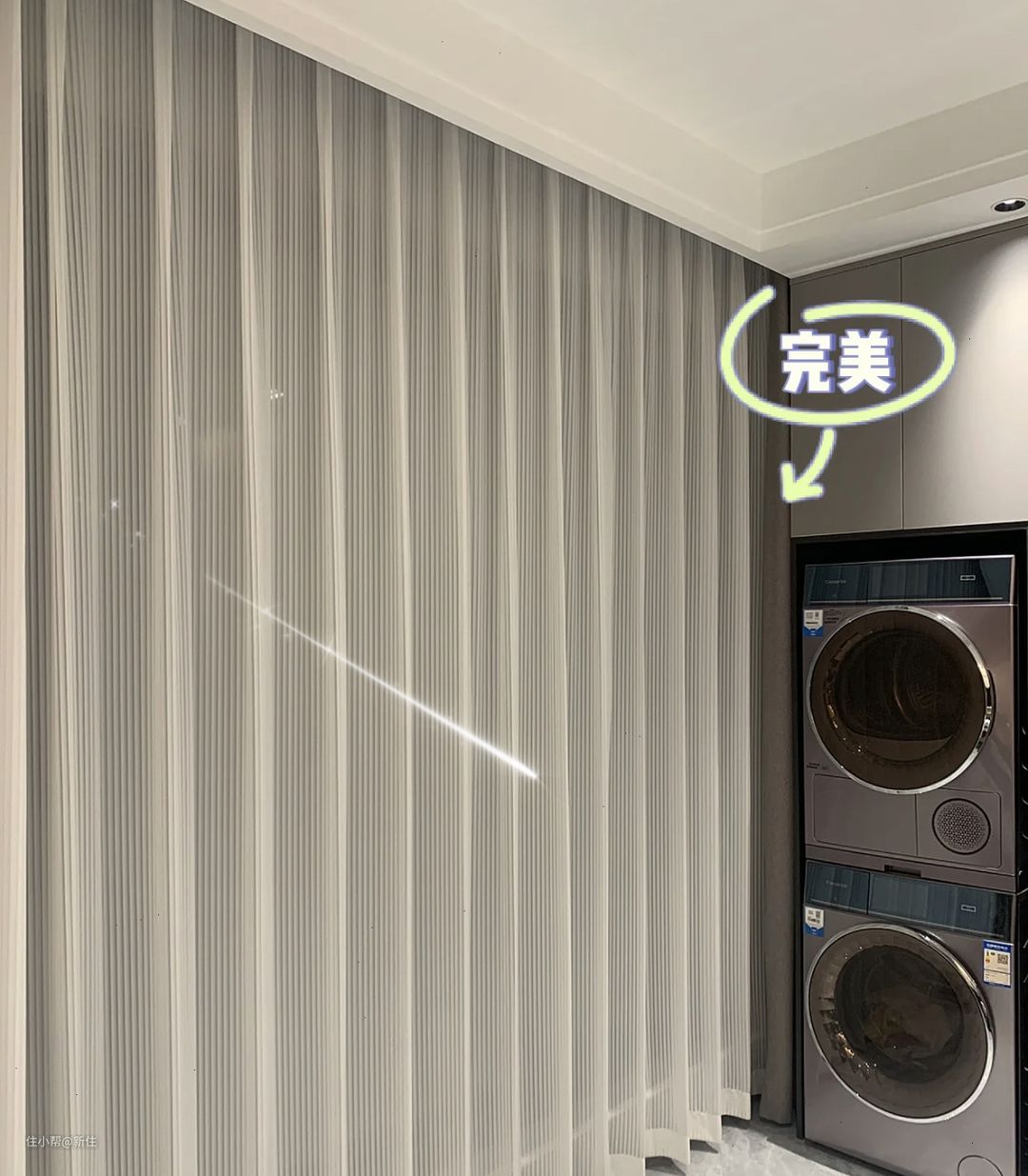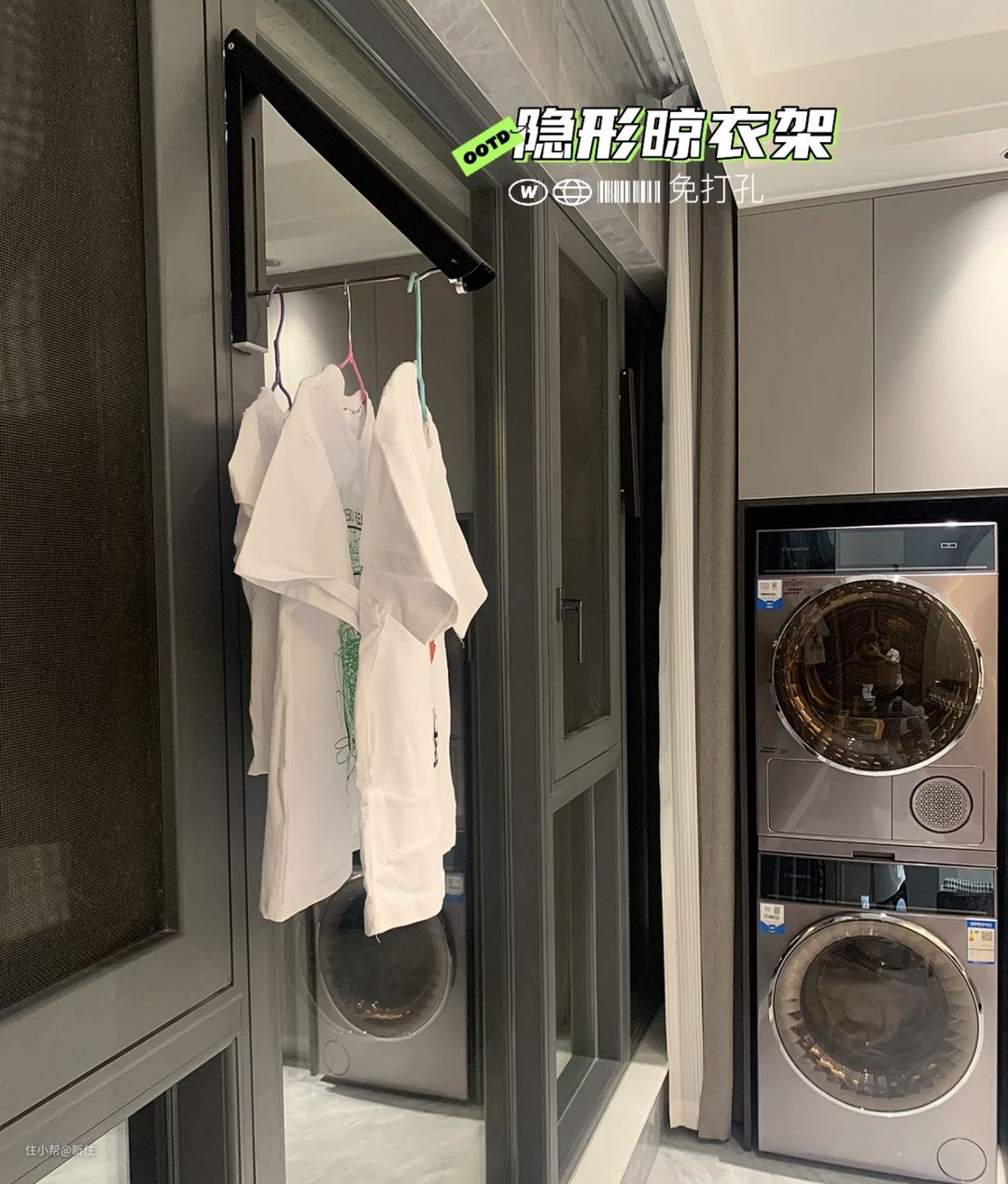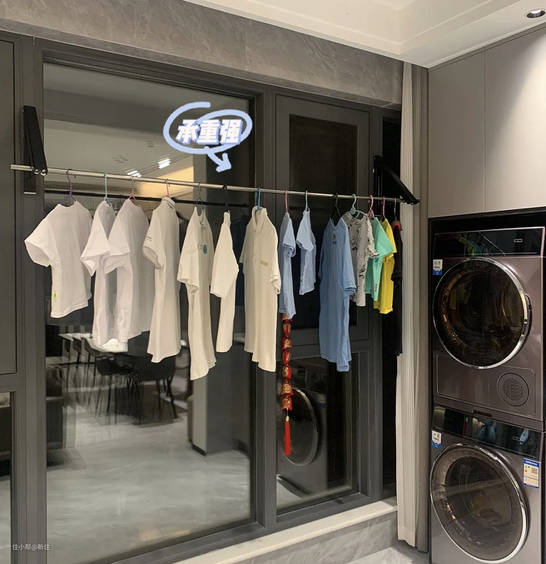 我家虽然有烘干机,可偶尔还是会有晾衣需求,不想在吊顶上装所谓隐形,实际走近依然能看到的晾衣架。