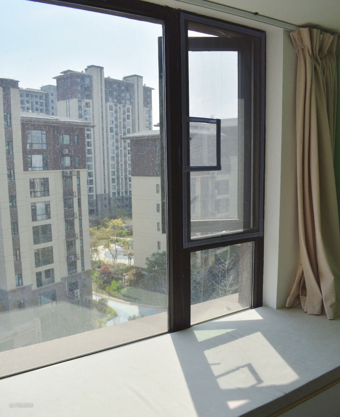 真正用了以后才知道,中间的方块是方便开关窗的一个设计,因为外开窗只能将纱窗安装在室内,如果是整片纱窗,把手处被遮挡,开关不方便。