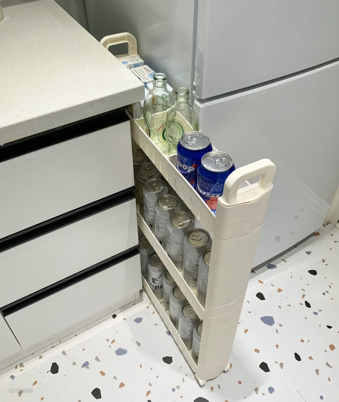 像我家橱柜与冰箱之间的窄缝,之前就因为利用不上,成为一个难打扫的卫生角,有了这个架子后,刚好能把这个窄缝填补。