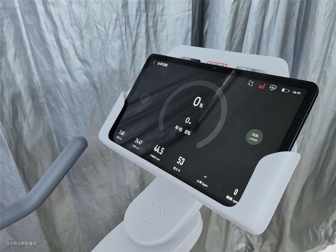 那么先说一下性能表现吧,首先是年龄段的友好支持,整部设备多个构造都能自由调节高度,车头支柱及座垫支柱,都有多个高度档位可调,座垫也能前后调整位置,基本上7岁以上的人群都能使用,这方面是特别友好的。平板/手机的支架,也同样可以针对不同人群的高度上下调整到适合的角度,方便运动时直观的看到实时运动数据和各种丰富课程内容。