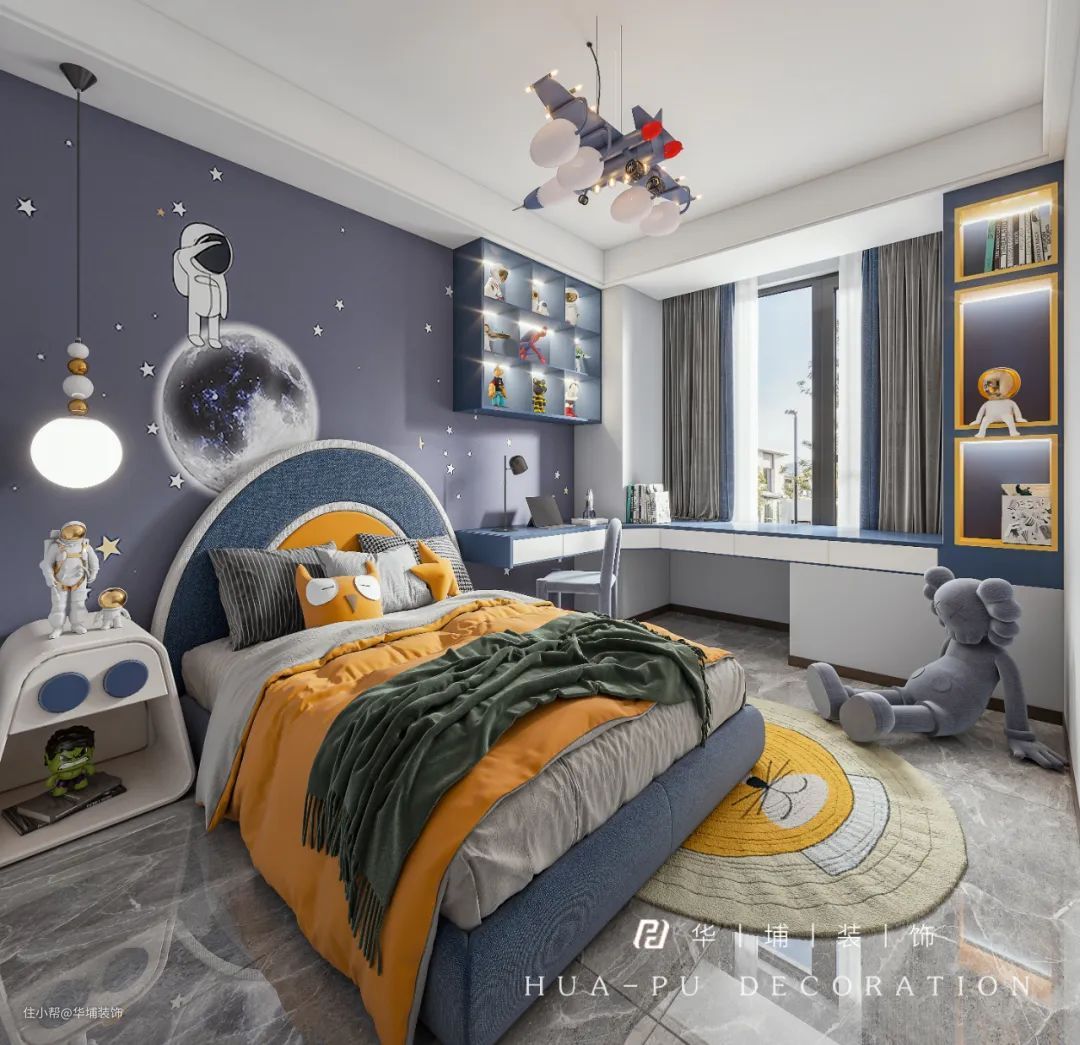 男孩房一改沉稳克制的空间语言,以灰蓝色主导,通过充满科技力量的元素奇幻装饰,给小朋友更多奇思妙想的发挥,陪伴成长。