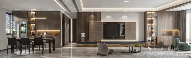 客餐厅开放式一体设计,增加通透延伸视觉。大理石与木饰面以自然原始的肌理,为客餐厅注入无限生机,细腻的触感,流利笔挺的线条,低度的色彩,彰显空间的睿智冷静与奢华质感。