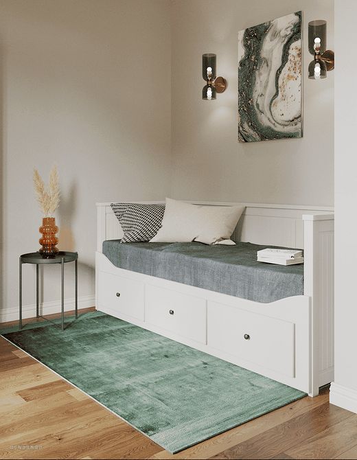 也可以使用地毯、镜子、花盆中的植物、画和框架中的杂志封面等装饰物作为分割方式。