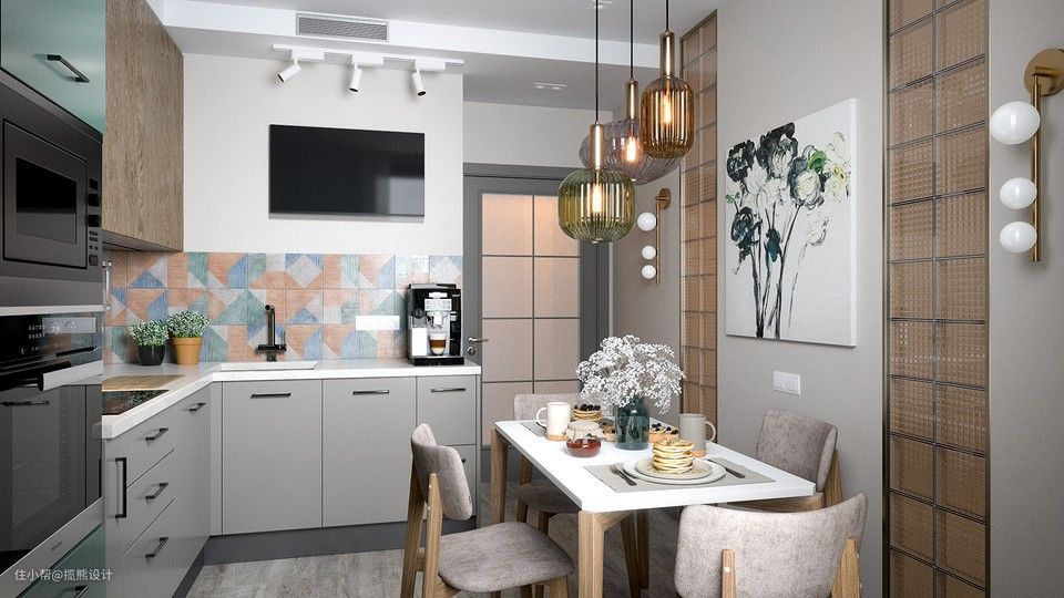 小户型一般客餐厅很小,在这个空间里要安装厨房用具、餐桌、沙发和舒适的电视区。