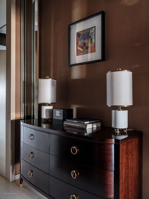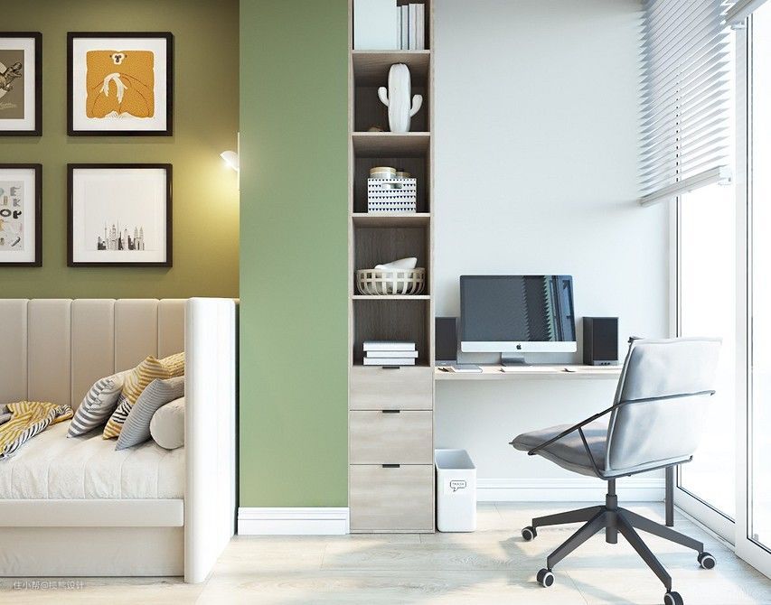 在橱柜家具的帮助下,一边是靠门的衣柜,另一边是用来存放书籍和装饰的开放式架子。