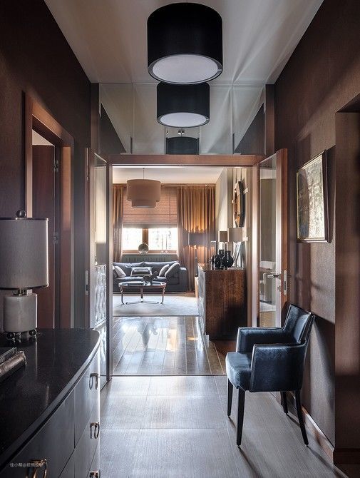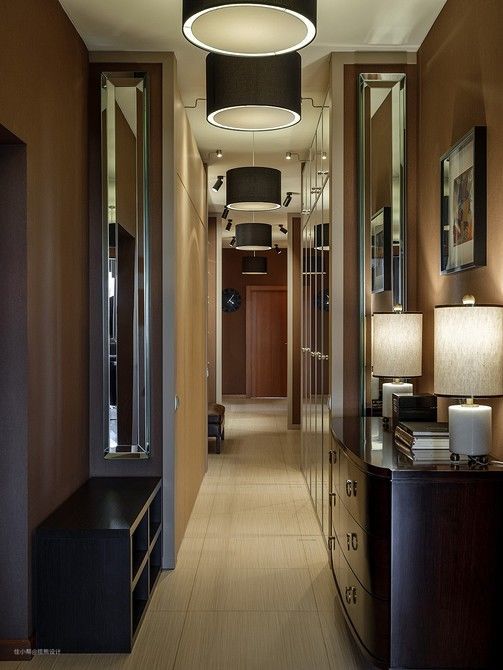 在一个非常长而狭窄的走廊,可以用小隔板把它分成4个部分,每个部分做一个空间的对应。