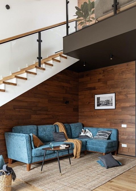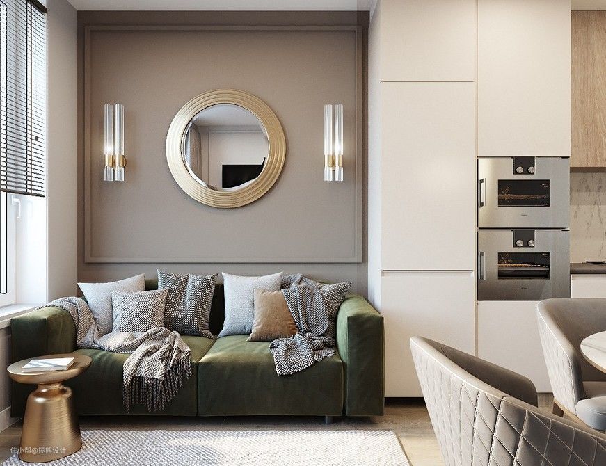 如果你把沙发和厨房放在一面墙上,通常我们会用一些跳色、镜子或其他材料突出沙发后面的墙壁。