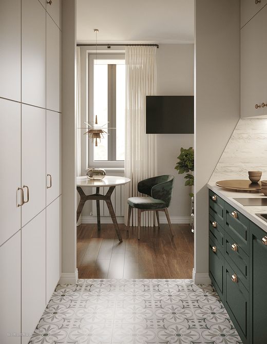 在这种情况下,重要的是在视觉上将厨房与客厅分开,做成两个区域而不是一个区域。