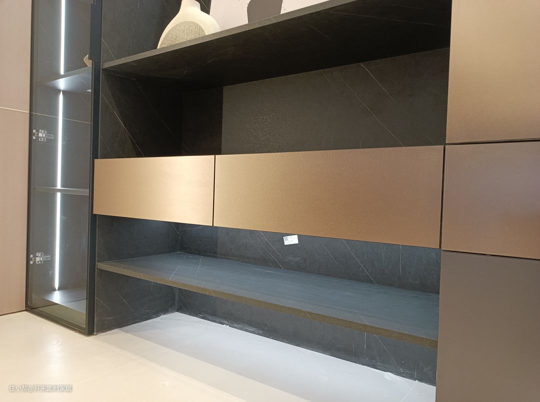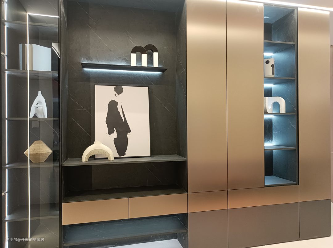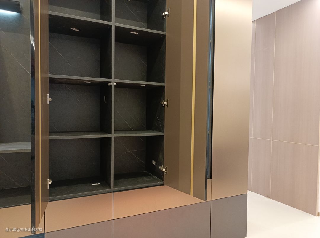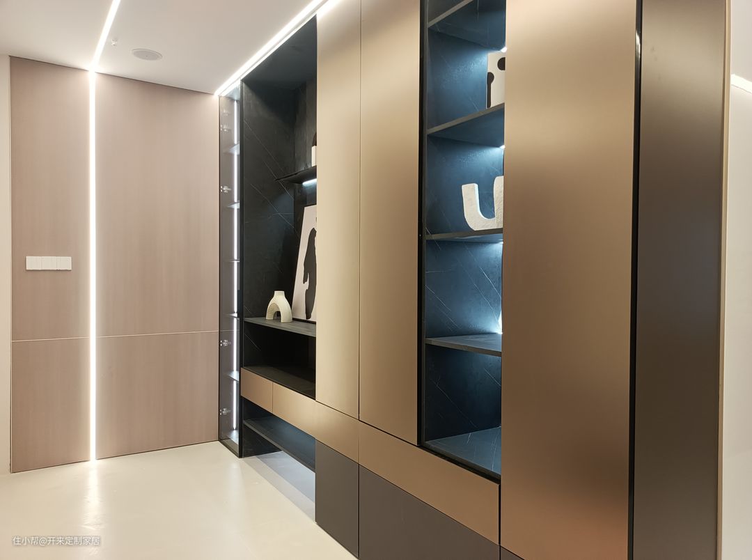 此次过道玄关柜采用璀璨金门板为主色调,别有眼前一亮的高级感,搭配卢卡岩与银河灰更显低调的奢华,一门到顶的铝框玻璃柜带来精致与通透~