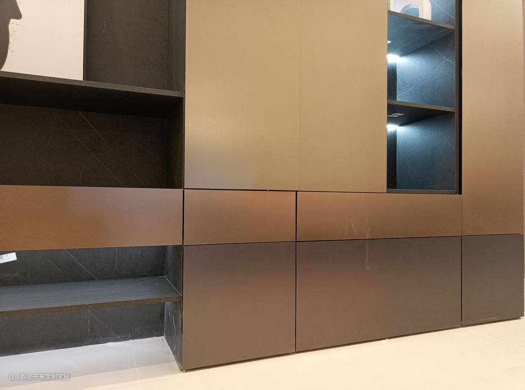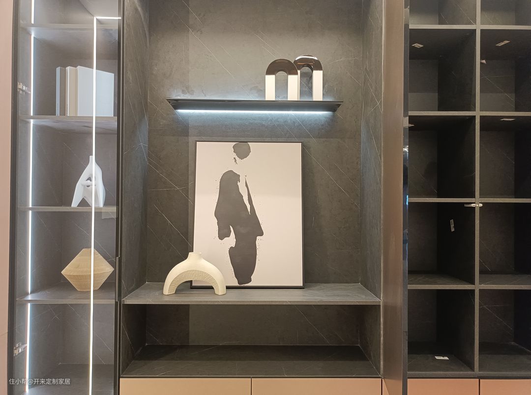 抽屉上方也加入隔板划分出置物区与装饰区,留空背板简设带灯超薄窄钢板架打造装饰区,通顶开架与实门柜内合理划分隔板尺寸,设计多层收纳空间,或开放展示或隐藏收纳~