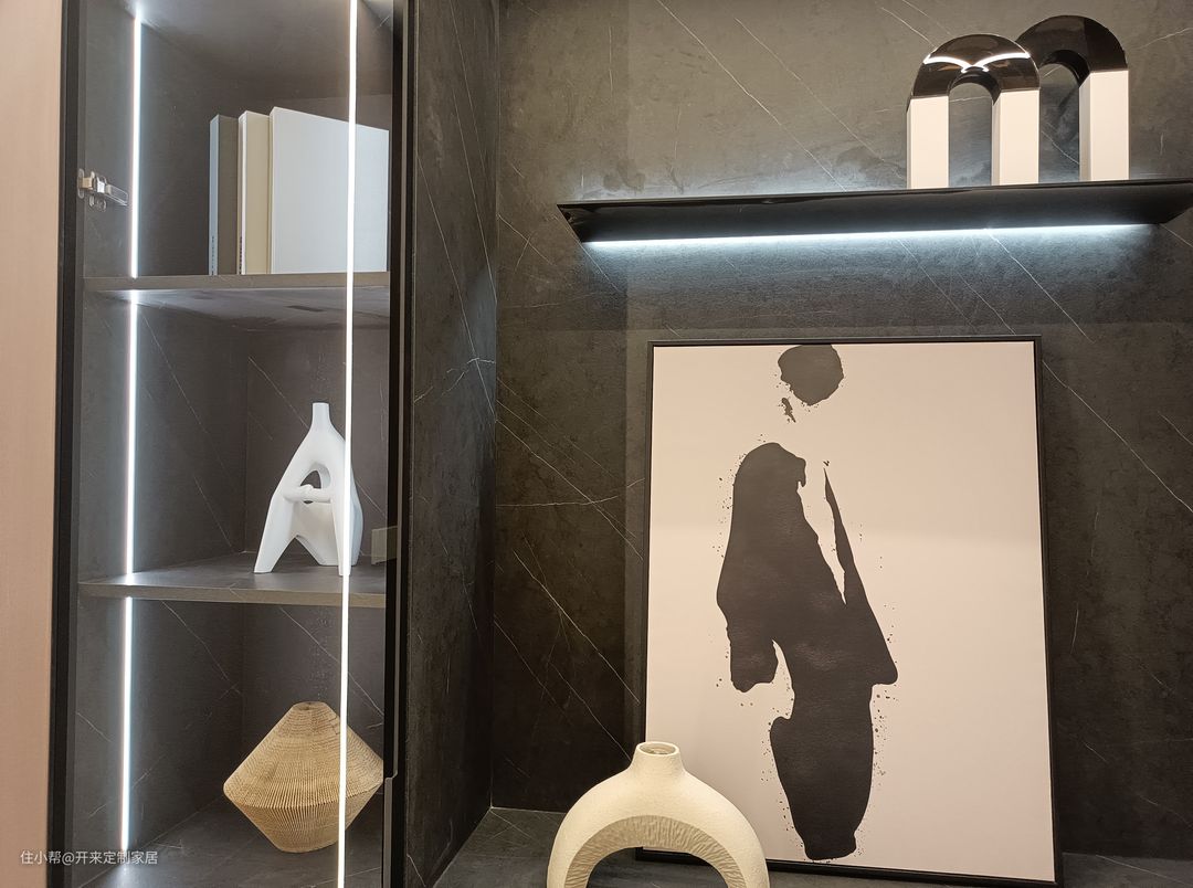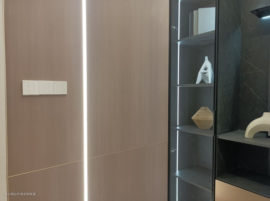 铝框玻璃柜内纵向设计感应灯带,与木纹平板护墙灯带相互掩映,实现材质与灯光的融合,收纳与装饰的平衡~