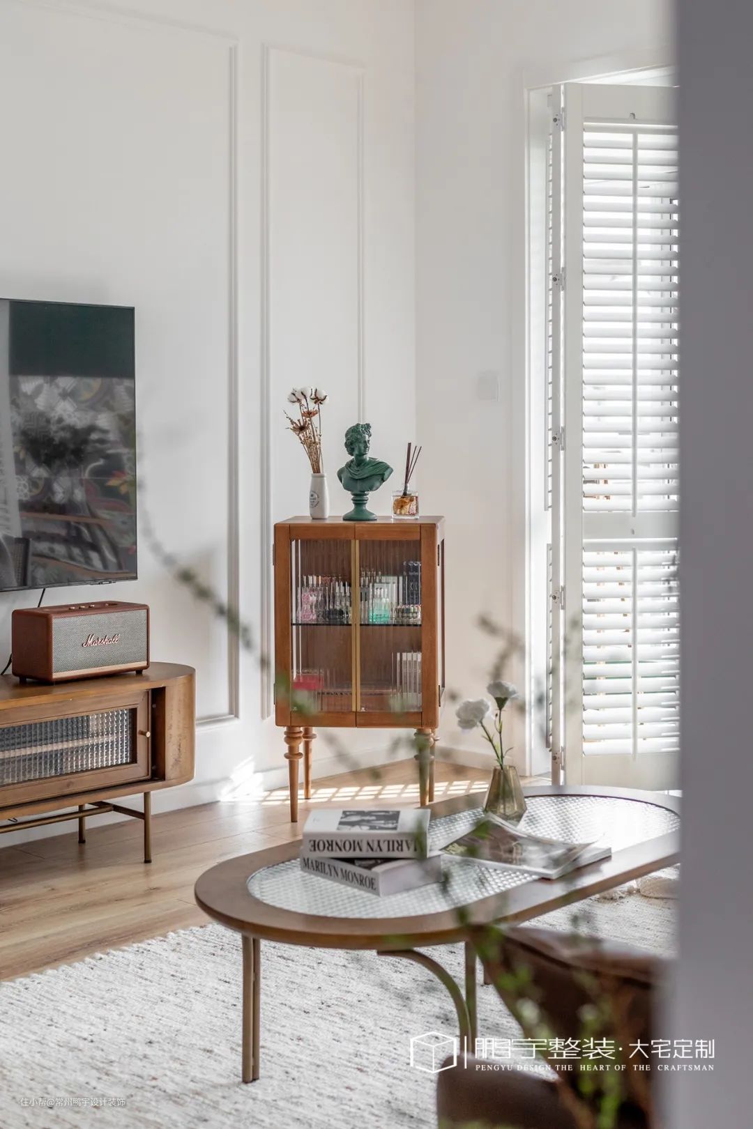 在现代年轻人的客厅布置中,对茶几的要求一般不会太高,通常会摆放一个小尺寸的茶几,然后在边角位置配上一个专属小边几;如果喜欢看书,也可以把边几换成一个小书架。这些小边几/书架平时就可以放在电视柜旁边。