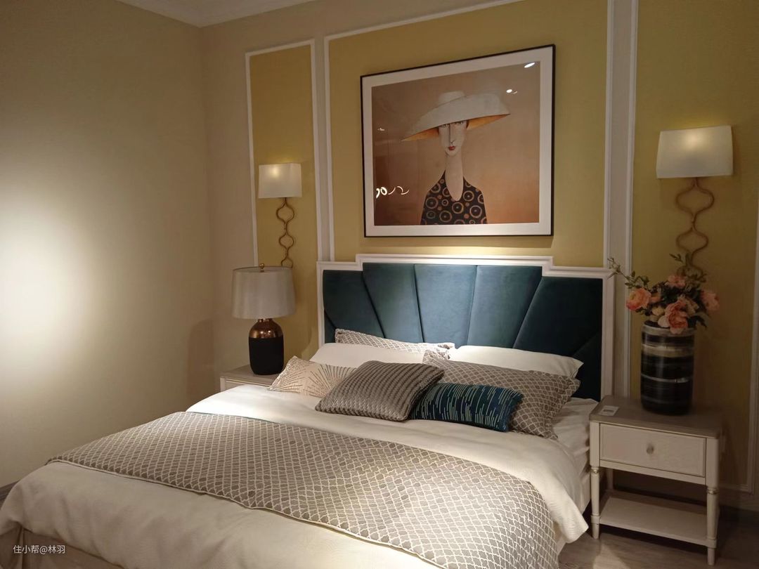 卧室也是暖黄色,石膏线背景墙,奶黄色乳胶漆,法式人物艺术挂画装饰墙壁,复古台灯和壁灯显得更加温暖浪漫,鲜花点缀有种精致艺术气息。