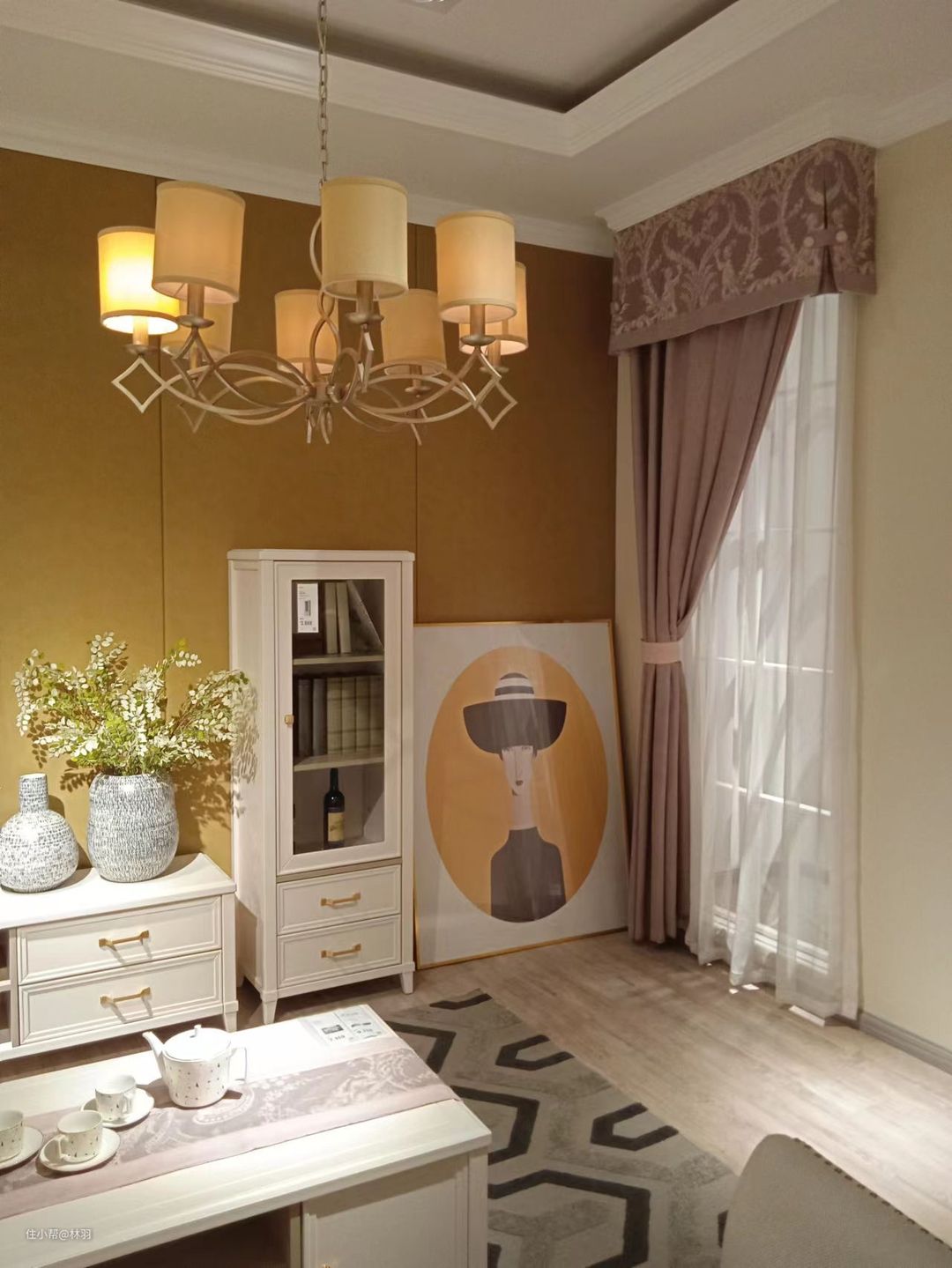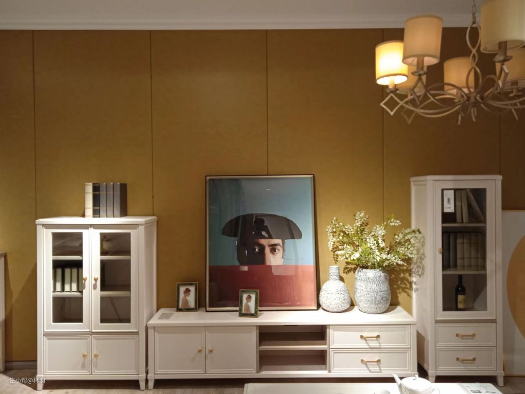 客厅整体色调为暖黄色,法式复古吊灯典雅温馨,优美的弧线,金属材质,宫廷风格,复古端庄,灯光柔和,纯白色储物柜,洁白无瑕,彰显主人的优雅气质和独特品位。
