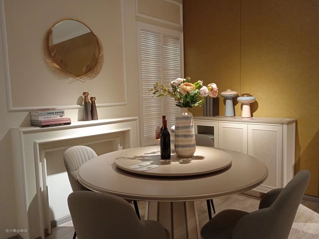 餐厅黄色背景墙,墙壁做石膏线造型,向外突出用做石台,运用镜面元素装饰墙壁,米白色圆形餐桌随意自由,设计餐边柜具有装饰作用,提升格调,增加收纳,桌面摆放一束鲜花使整体氛围更加浪漫优雅。