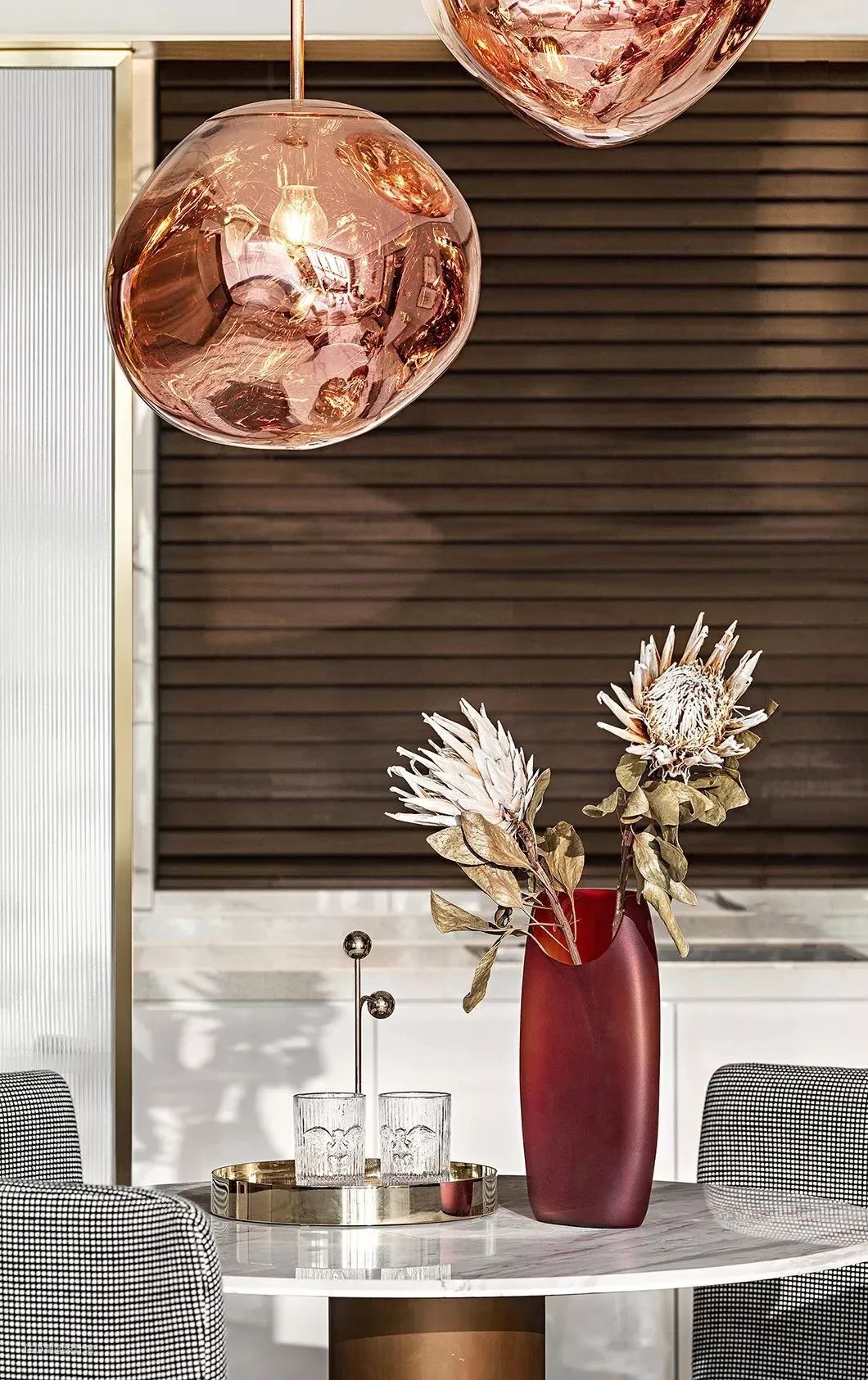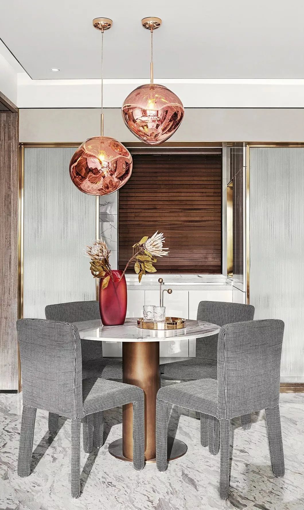 ▲餐桌上精致的金属茶盘、玻璃杯、红色花瓶,加上玫金色的吊灯,营造了一个华丽精致的用餐空间氛围。