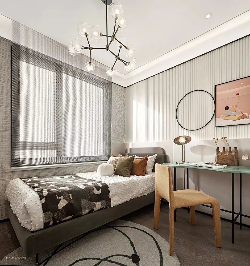 ▲床头墙是硬包墙脚+白色波纹板的背景墙,床头旁布置一张简易的小书桌,书桌摆设台灯、杂志与花瓶,搭配黄色的布艺凳子,墙面挂上圆环+挂画,整个空间显得简洁从容而舒适优雅。