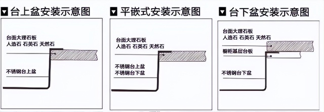 选好了水槽,下面我们来说说水槽的安装。市场上水槽的安装方式可以分为三种:台下盆、台中盆、台下盆。