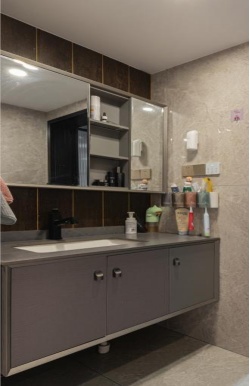 整个洗浴区仿佛一个“灰色空间”,应用的是浅灰色的大理石瓷砖。地面抬高近2cm,方便洗浴水的渗透,做到不堵塞。上面是铝扣板集成吊顶,便于通风,空气流通更顺畅。