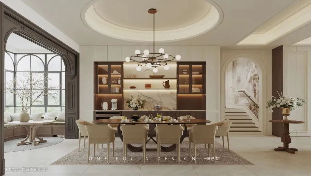 餐厅宏伟大气的圆弧形吊顶搭配胡桃木的长条餐桌,深木色餐边柜满足了餐具的收纳和装饰品展示需求,优雅沉稳的配色与法式元素的运用让用餐环境充满精致的仪式感。一角打造休闲阳台,拱形窗下设置转角卡座供人休息娱乐。