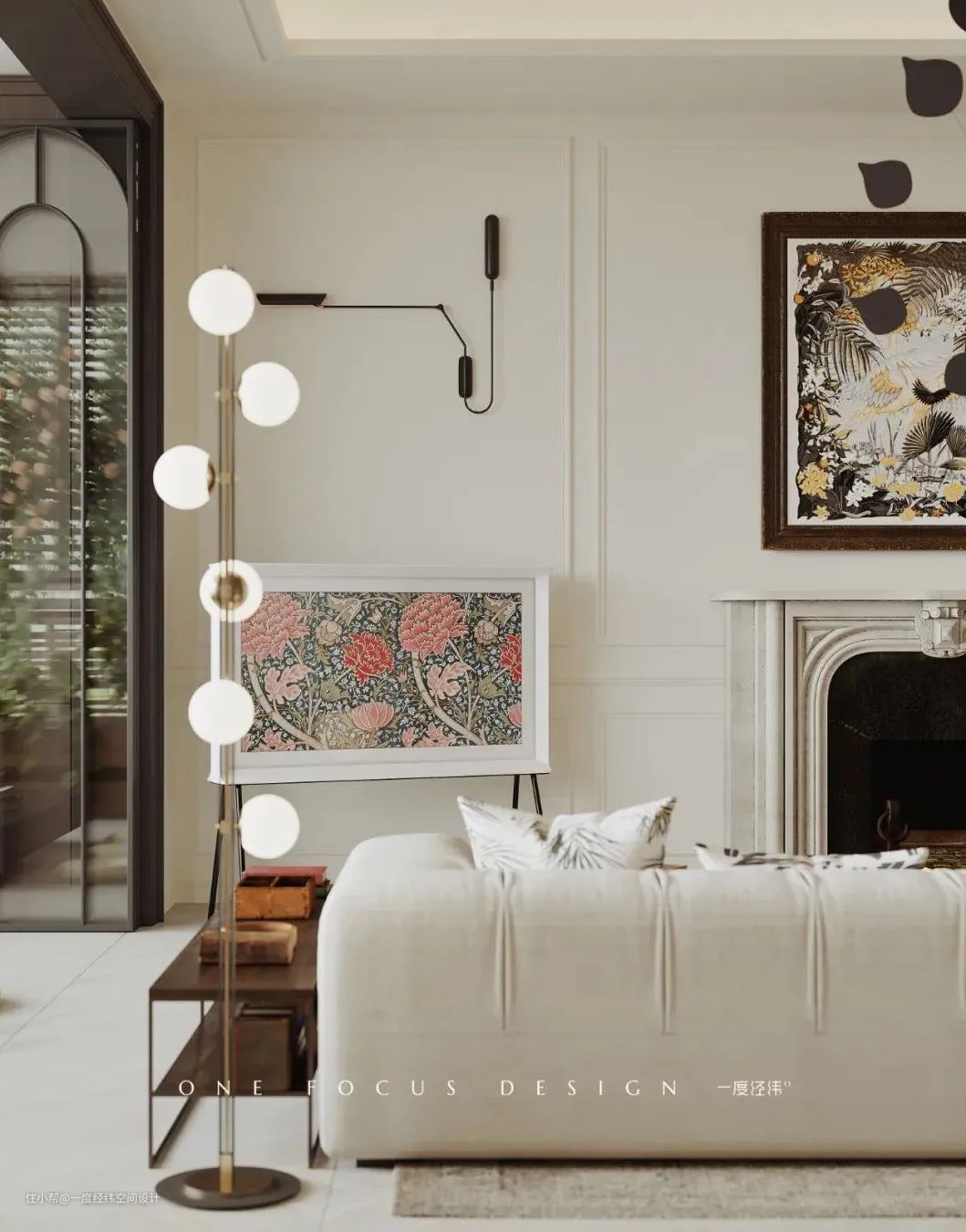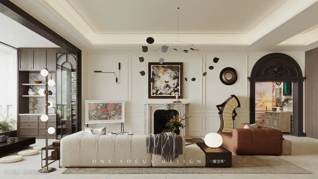 ③客厅没有做电视背景墙,采用落地画境电视与壁炉挂画结合,营造法式氛围感。