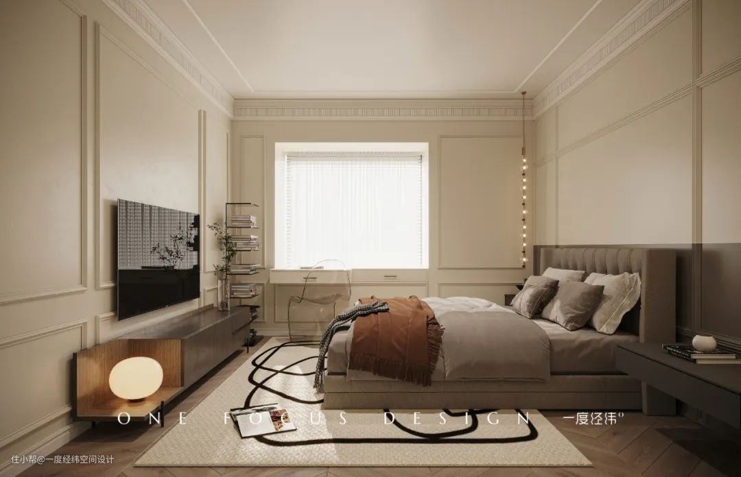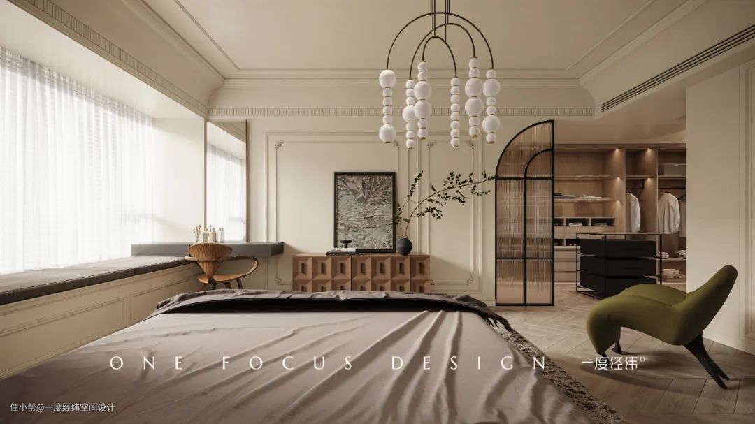 奶咖色与木地板碰撞,让卧室变得鲜活,满溢复古的异国情调。图形化的石膏线条,不同造型的装饰品、时代感极强的家具、装饰物,提升空间质感的同时,也打造出一种具有艺术色彩的亲密氛围。柔软的白色床品和白色珠型吊灯相呼应,让整体的氛围感多了一丝绵柔与轻盈。