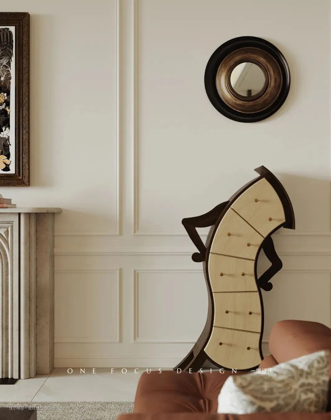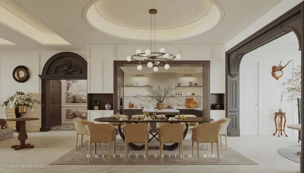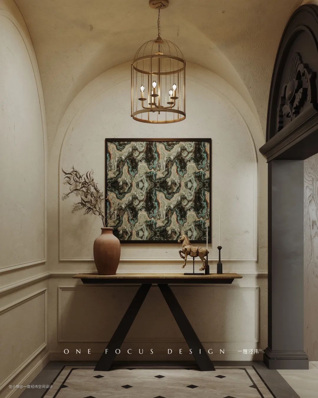 进行换鞋等操作后,设计师将玄关区域在视觉上进行了划分,用典雅端庄的摆饰形成一处极具仪式感的内玄关,鸟笼吊灯、马匹摆件、陶罐花瓶、彩绘挂画和拱形墙面共同营造出中世纪风的独特美感。