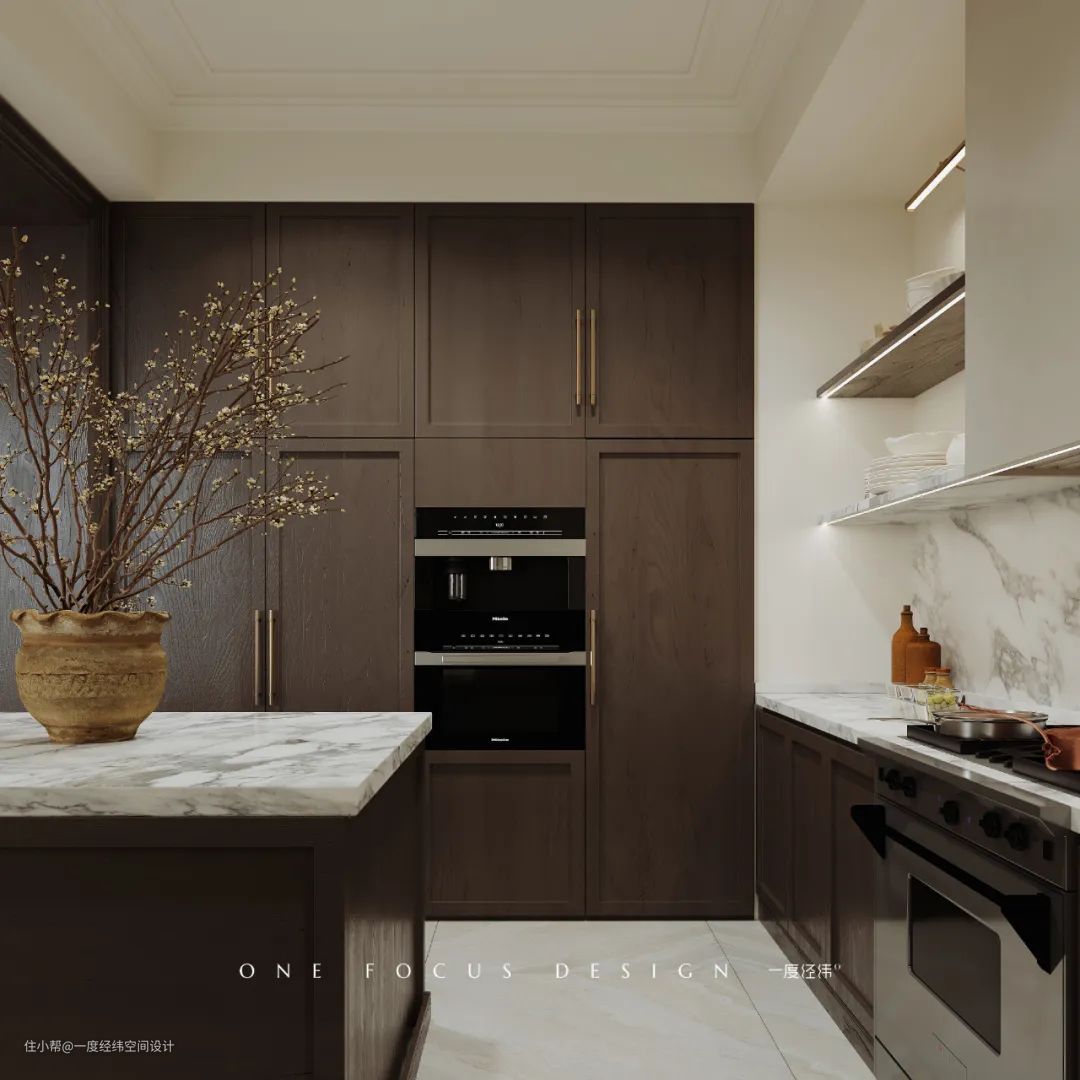 开放式厨房让空间与空间产生更多的交互,白色的大理石与木饰面进行搭配交融,墙面反射的光并浮现色调温和的影子,夹杂着油盐酱醋的日常,让生活因此也变得美好。