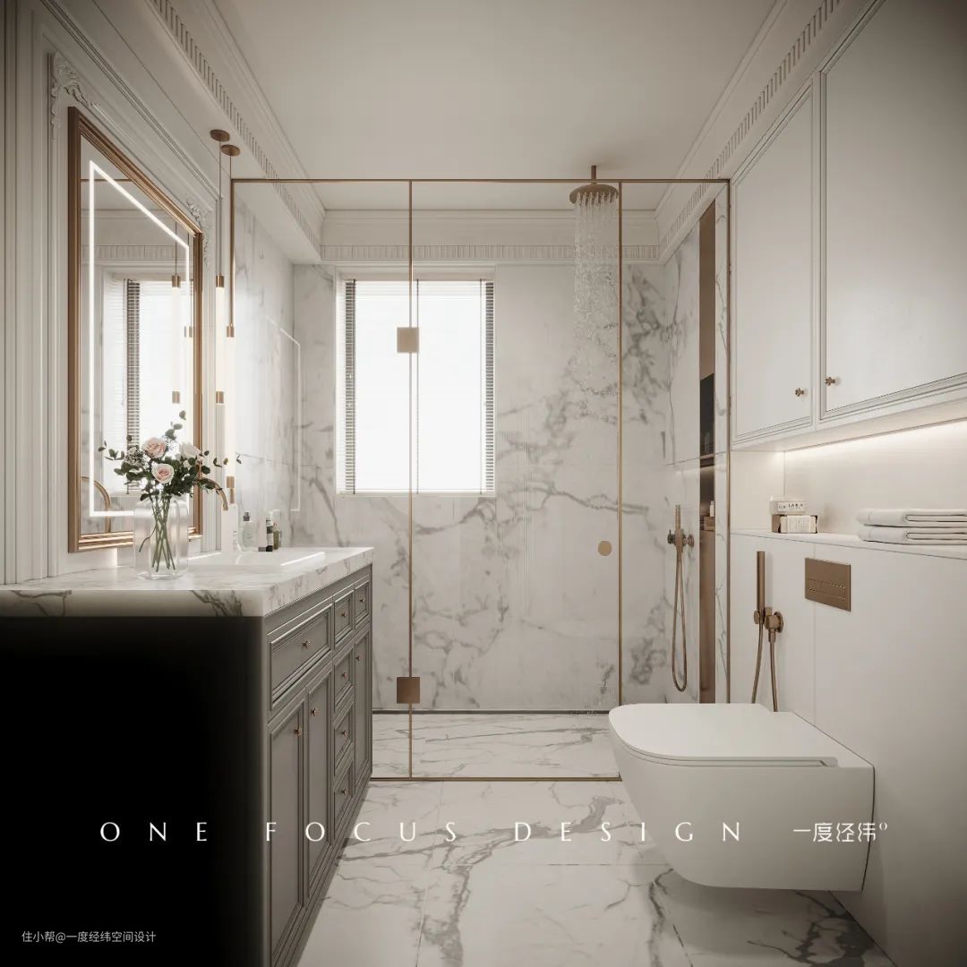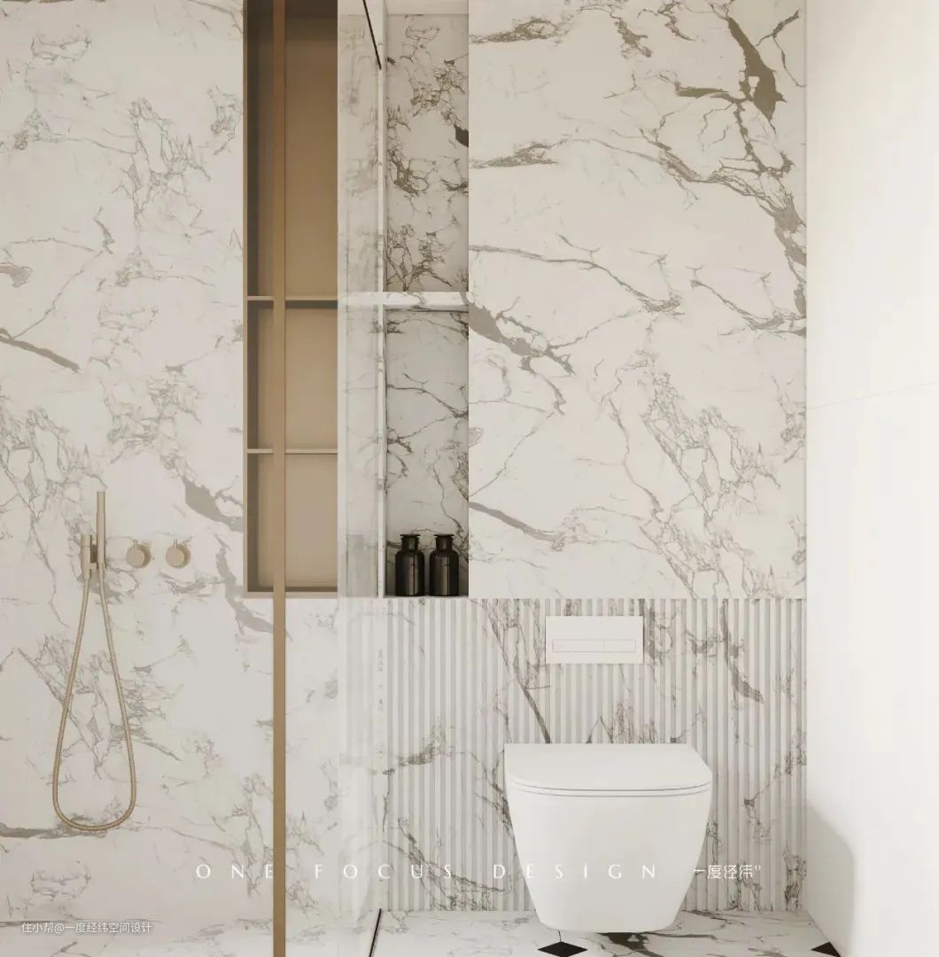 主卫则是用白色系打造明亮通透的视觉感受,大理石墙面搭配铜金元素,高级又复古,不会显得归于繁杂,点缀得恰到好处。