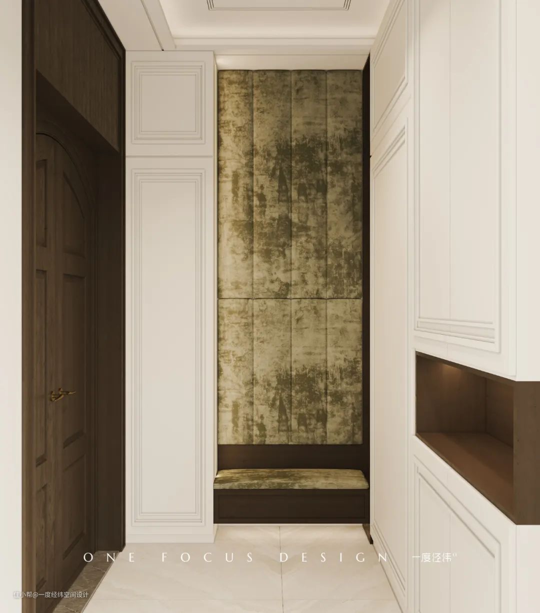 对法式复古的空间追求从一踏进家门就开始了。外玄关设置了简洁的白色墙柜作为鞋子和随身包包衣物的收纳区域。