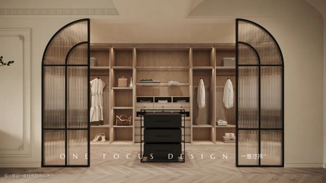 衣帽间做的开放式设计,黑色与木色调和出别致的高级韵味。拱形推拉门采用长虹玻璃打造,兼具隐秘性与朦胧感,让整体的颜值一下子拉升,优雅又内敛。内部设置中岛台,用来放置饰品等小物件。