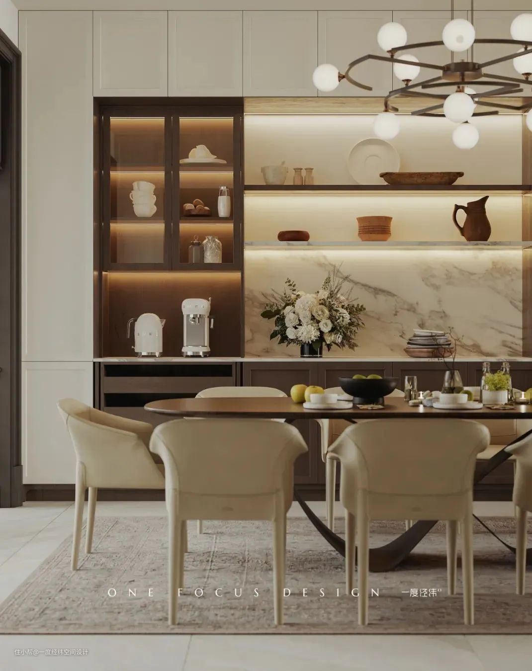 ④餐厅餐边柜储物功能划分清晰:咖啡柜、零食柜和展示区;厨房增设法式大岛台,实用又美观。