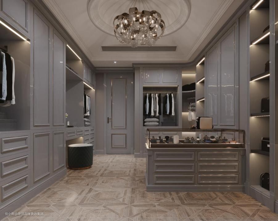 对于女士来说,没有什么是能够比衣帽间更浪漫了的事物。设计师在美式轻奢的基础上,利用金铜色的花卉造型吊灯,营造出一种精致的复古感。四周顶墙打造的储物柜,利用整齐利落的石膏线,实现开放区和封闭区的区分。