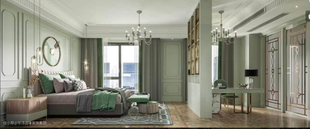 整体的薄荷绿色充满自然清新的感觉床头背景板和墙壁都做了法式雕花,床头两边的吊灯,是房间充满怡情。办公区与睡眠区通过书橱墙壁进行隔断。舒适感大大的提升。