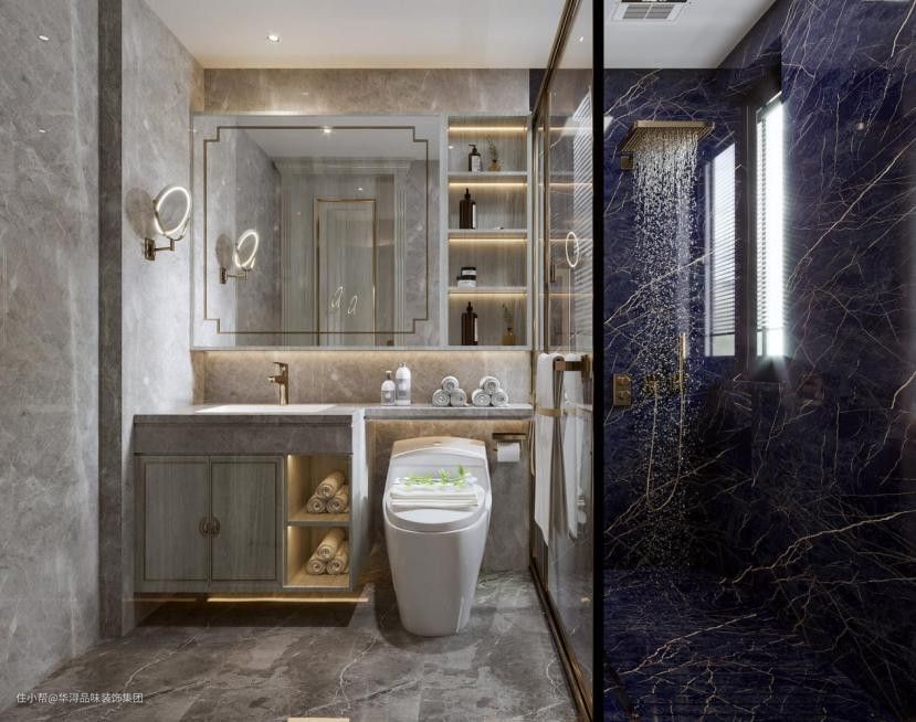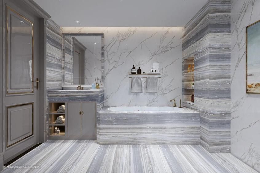 卫生间使用岩层花纹大理石,明亮舒畅。使用浴盆,增加生活仪式感。后侧挖空做置物架,用来摆放护肤品。上侧做悬空置物架用来悬挂衣物毛巾,方便拿取。