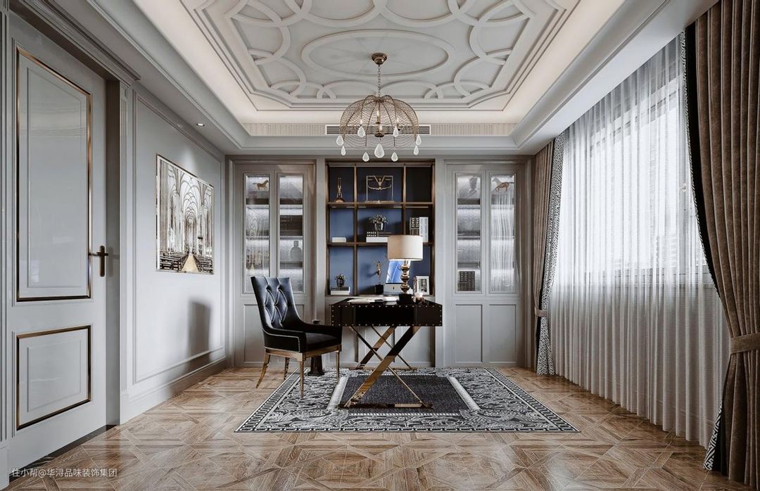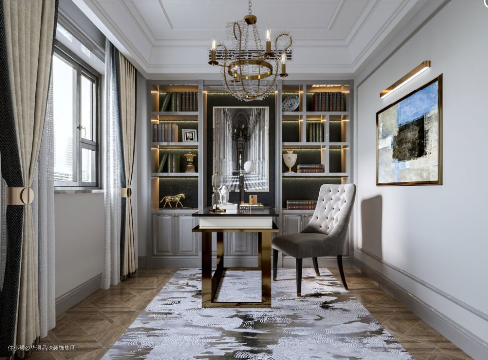 美式复古轻奢书房,简单的吊顶搭配极具设计感的吊灯。极具深意的黑白宫廷壁画,两侧做隔板当作书柜。灰色沙发椅,为读书提供舒适感,有了更好的读书体验。
