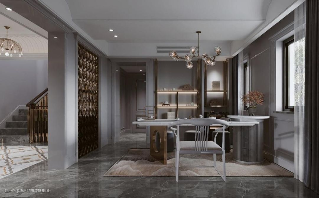 美式与中式的完美结合。茶桌+岛台的奇妙搭配,让做茶到饮茶更加有序。茶桌后做置物架,用来摆放茶具,使用起来更方便。