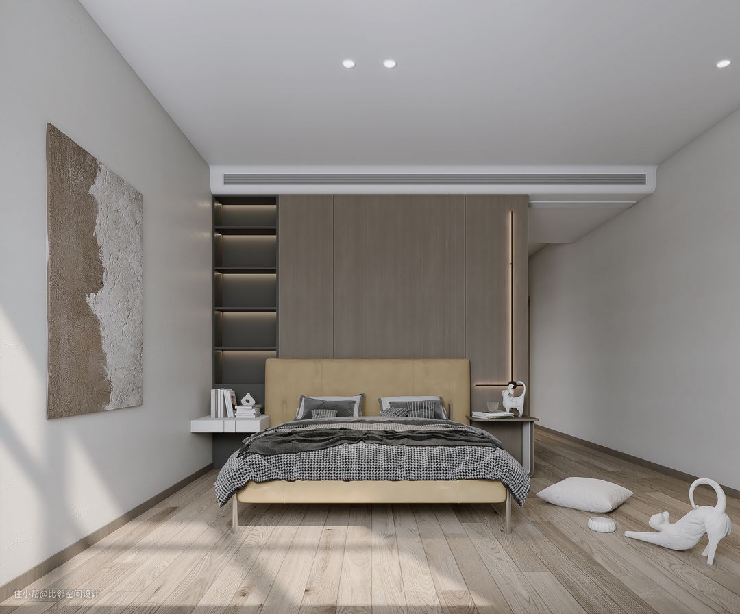 在有限的平地上,为了增加使用面积,可以放弃一侧的走廊,改成一张靠着墙壁的床,这样不仅可以让房间变得更大,也可以让卧室的布局变得更流畅,也可以减少床铺之间的隔断,方便规划和利用。由于卧室的收纳和移动空间都很有限,所以可以选择一张有储物功能的床柜,充分利用床下的空间,或者将床隐藏起来,不需要的时候,可以将床放入墙中,这样就不会占地方了。