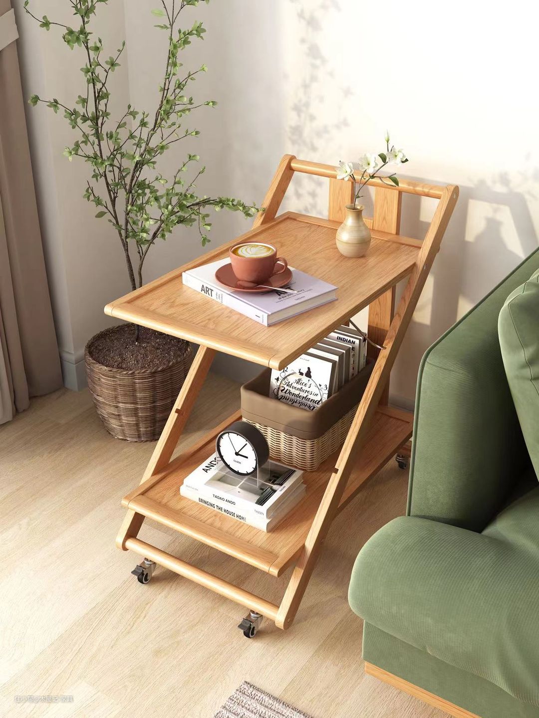 木屋记沙发边几实木小推车可移动茶几带轮双层置物架折叠边几收纳