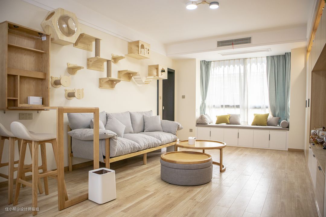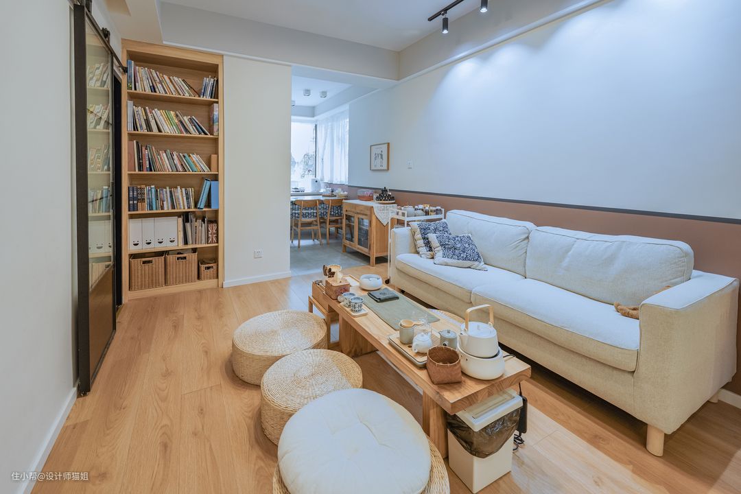 夫妻两入住,核心区没有采用传统的家具布局,加高做了地台设计,带点禅意的感觉,背板延伸到墙面,放置了日式座椅,舒适度满分。吊顶采用的是木地板上墙,整体的统一调性是屋主喜欢的基调。