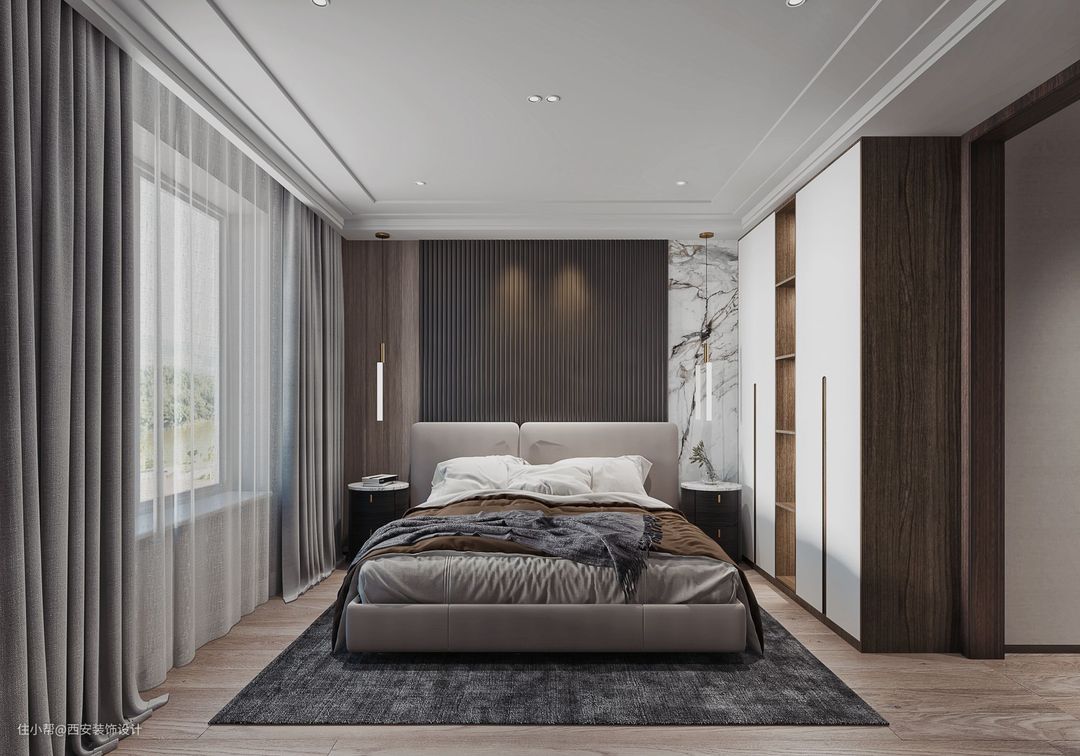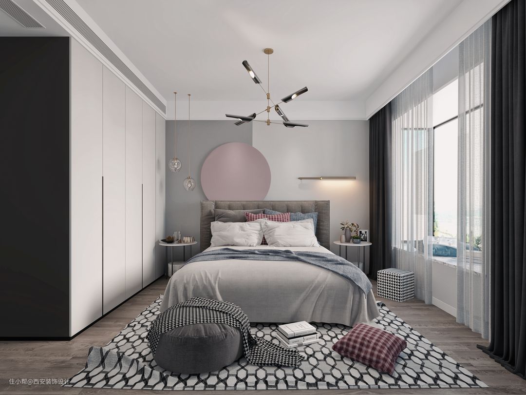 卧室作为一对夫妇的房间,卧室的颜色延续了灰色的风格,气氛安静而清晰。灰粉色背景墙使空间平静而不单调。深色木制家具与石膏线天花板和原木色地板相匹配,营造出安静舒适的空间氛围。