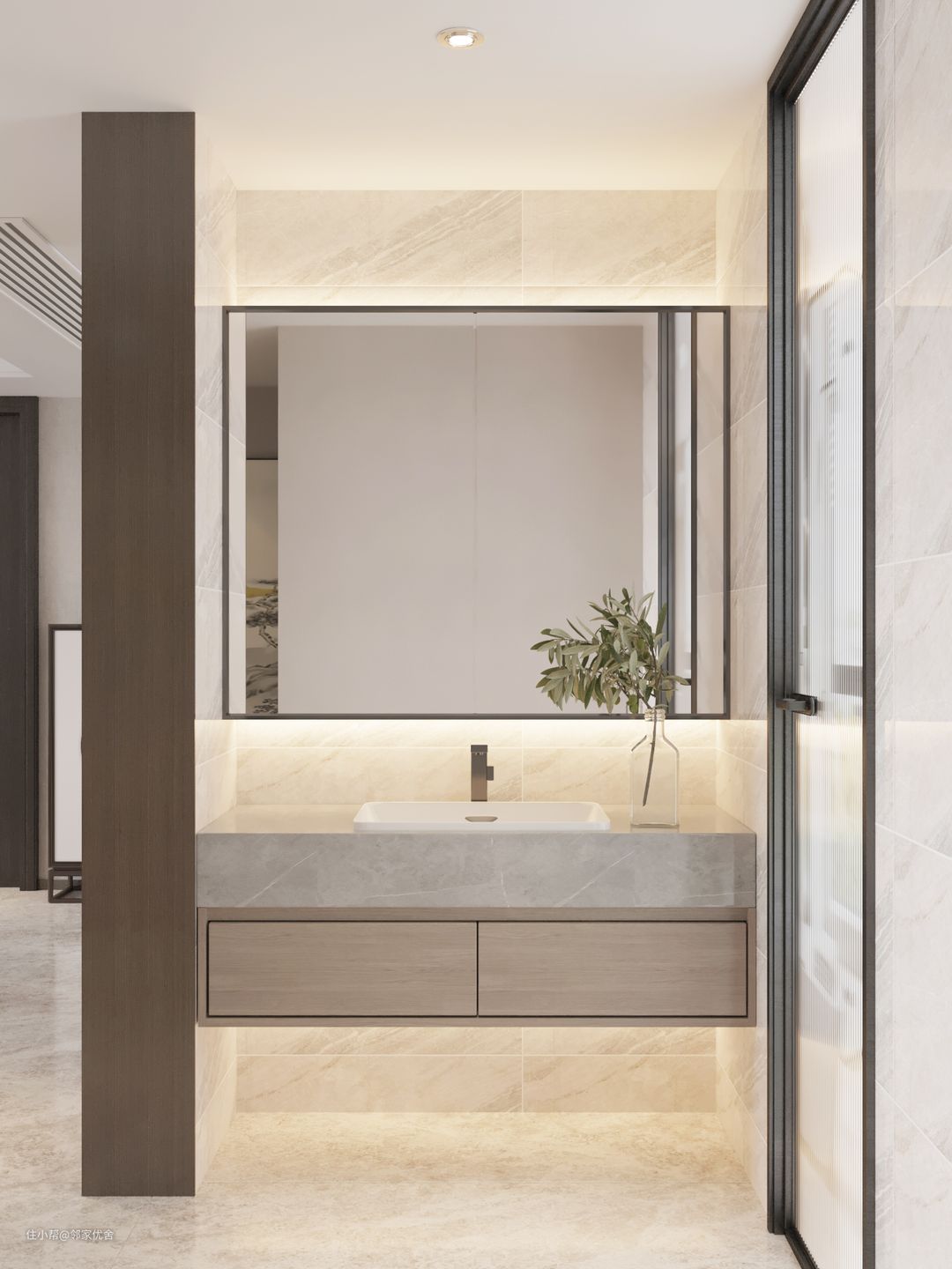 洗手池采用墙排工艺,更加美观,同时不留卫生死角,台下还可以放置扫地机器人或者浴室拖鞋等。超大的镜面,原木色的储物柜,整体线条简约、利落,再搭配暖黄色的灯光,素雅又温馨!