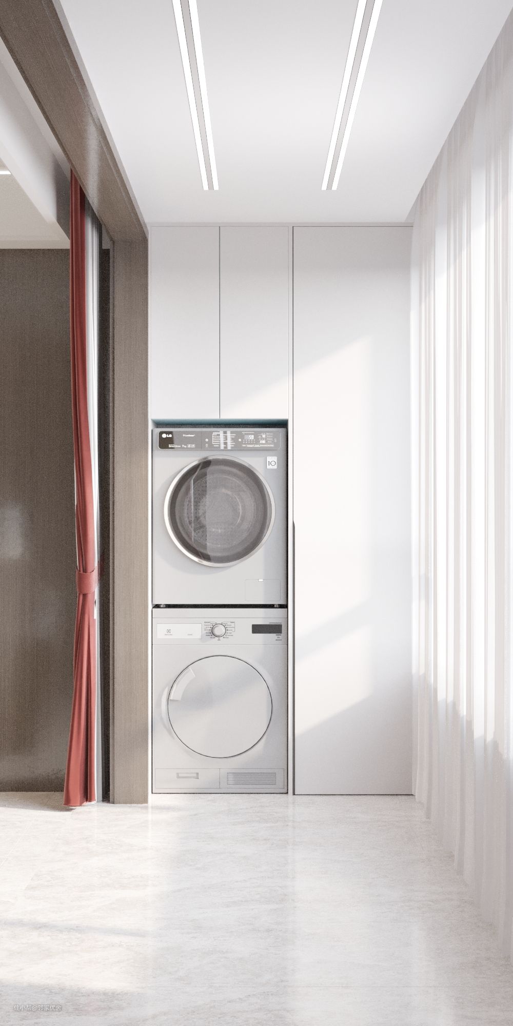 收纳型阳台,充分利用阳台空间,配备一通到顶的收纳柜,放置洗衣伴侣,收纳美观兼具,白色纱帘设计,透光性好,也更加梦幻美观。