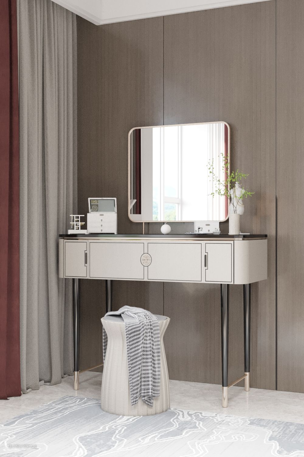充分利用卧室空间的角落,在靠墙位置,不仅可以把转角处利用起来,而且增加了卧室的美观性,妆镜与墙面能贴合,梳妆台会更加稳定,而且不占空间。