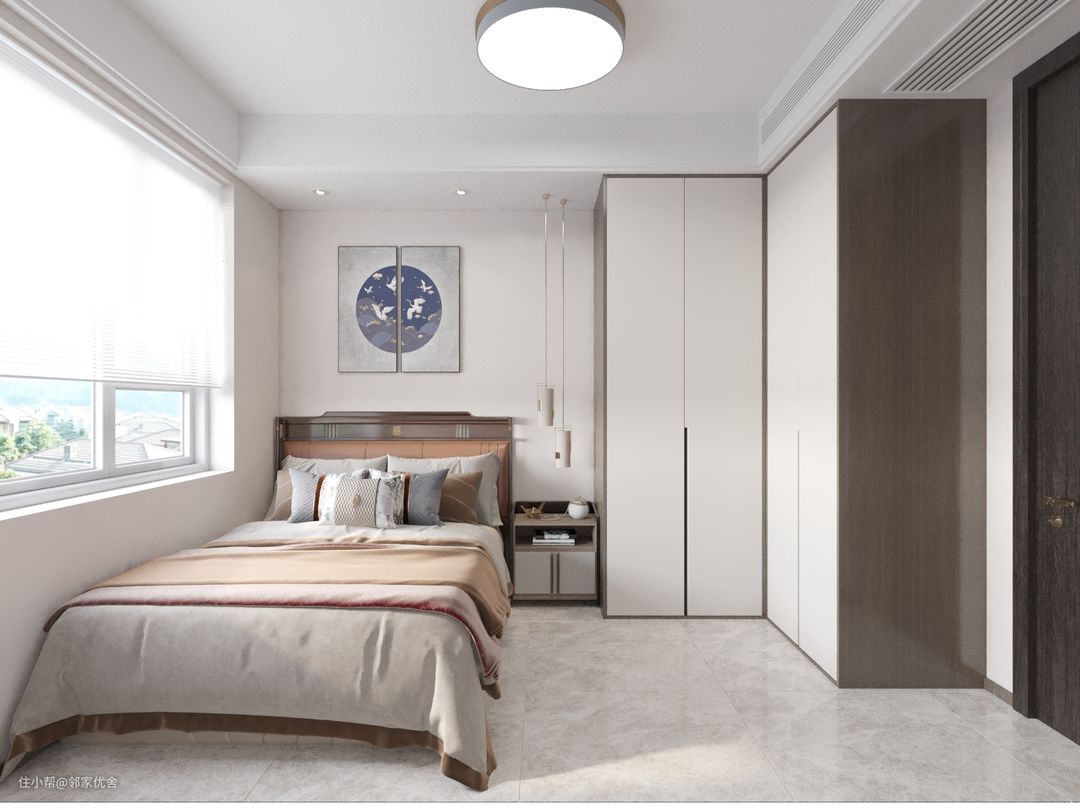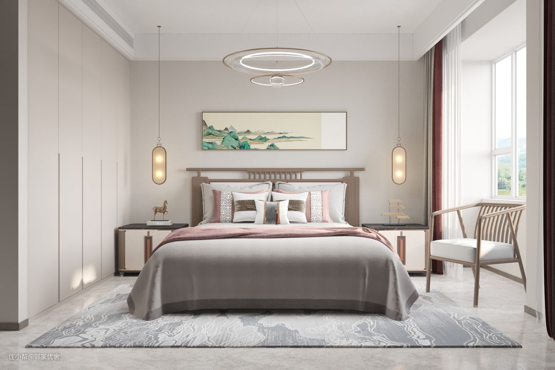 卧房简约时尚,简洁的床体造型,搭配独具雅韵的水墨挂画,床品也尽显中式的雅致与质感,整个卧室氛围雅致又大方。卧室的用色偏向舒缓、雅致,与整体气质和谐统一,传达着家居主人的审美品味。
