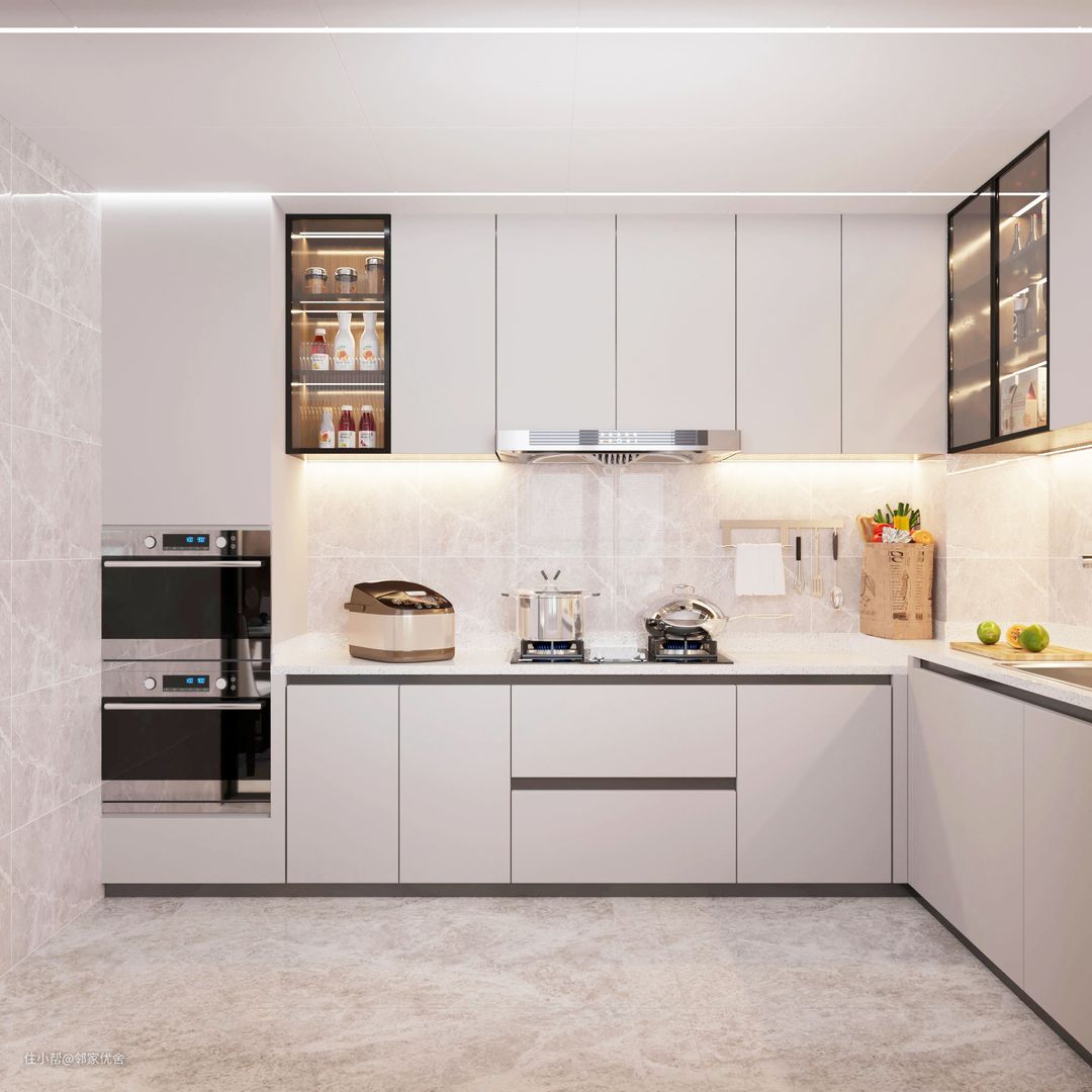 厨房延续电视背景墙的色调,保证简约干净的质感。利用米白色来中和中式风,既因为它的“净”和“简”体现了极简主义,又让整体风格显得明亮而活泼。