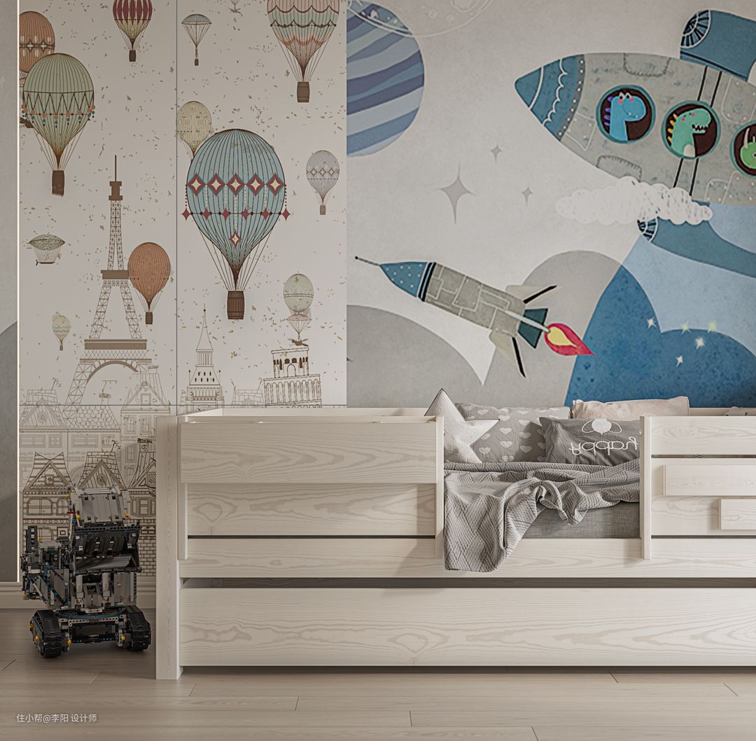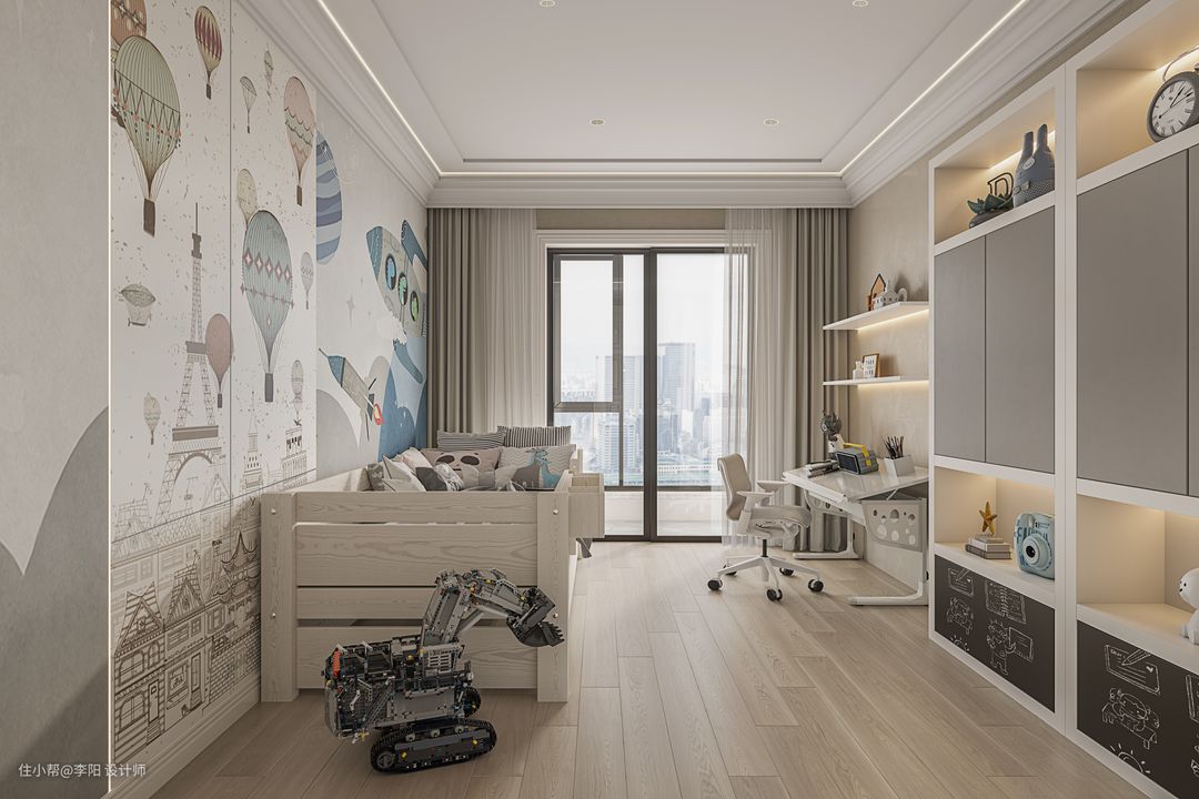 在儿童房的设计中注重童趣的表达,打造出了一个儿童的梦幻空间。位于这个空间中可以感受到自由和慢节奏,简单纯粹的设计美学更能找到生活和身心的平衡。