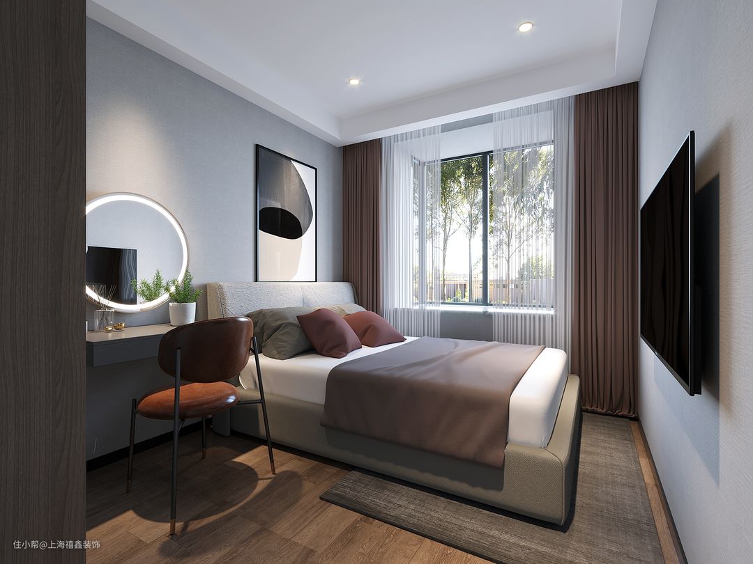 【次卧】次卧延续主卧的风格和色调,简单的艺术画打破灰色墙面的沉闷。木质梳妆台替代床头柜,储物与收纳功能完备,使用更加便利和快捷。