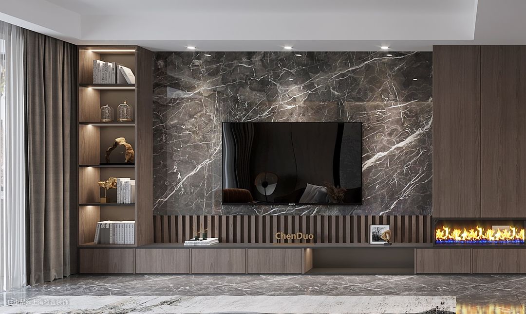 【客厅】客厅做了无主灯设计,清晰地照亮每一寸空间,吻合简约主义的作风。原木与灰色带来高贵优雅,格栅拼接大理石流露出轻奢的气息。U型柜美观,又有超强收纳能力。